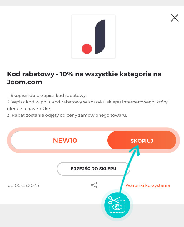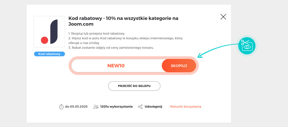 Skopiuj lub zapisz kod rabatowy i kliknij przycisk "Przejdź do sklepu". Nastąpi przekierowanie bezpieśrednio do sklepu internetowego Joom.com.