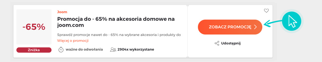 Wybierz konkretny rabat Joom na naszej stronie i kliknij przycisk "Zobacz promocje". Zostaniesz automatycznie przekierowany bezpośrednio do oferty specjalnej w sklepie internetowym Joom.com, w którym możesz kupić produkt ze zniżką.