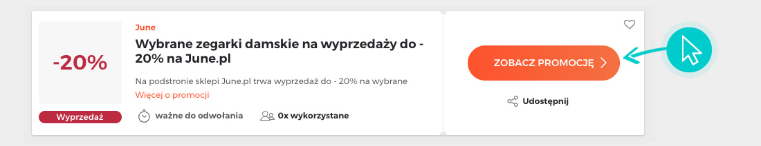 Wybierz konkretny rabat z June na naszej stronie i kliknij przycisk "Zobacz promocję". Zostaniesz automatycznie przekierowany do oferty promocyjnej w sklepie internetowym June, gdzie możesz kupić wybrany produkt ze świetną zniżką.