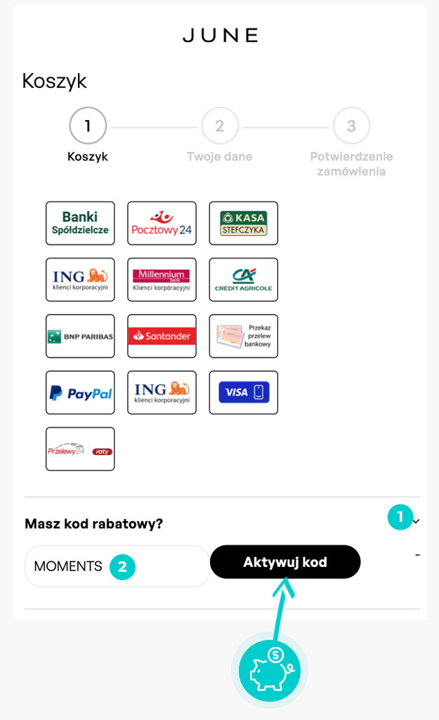 Wybierz w e-sklepie June produkt, który Cię interesuje, naciśnij przycisk "Dodaj do koszyka", a produkt automatycznie zostanie dodany do Twojego koszyka z zamówieniem. Po prawej stronie, w sekcji "Twój koszyk" znajdziesz pole "Masz kod rabatowy?". Tutaj wklej skopiowany kod rabatowy bądź wprowadź go ręcznie, i zatwierdź przyciskiem "Przejdź dalej".