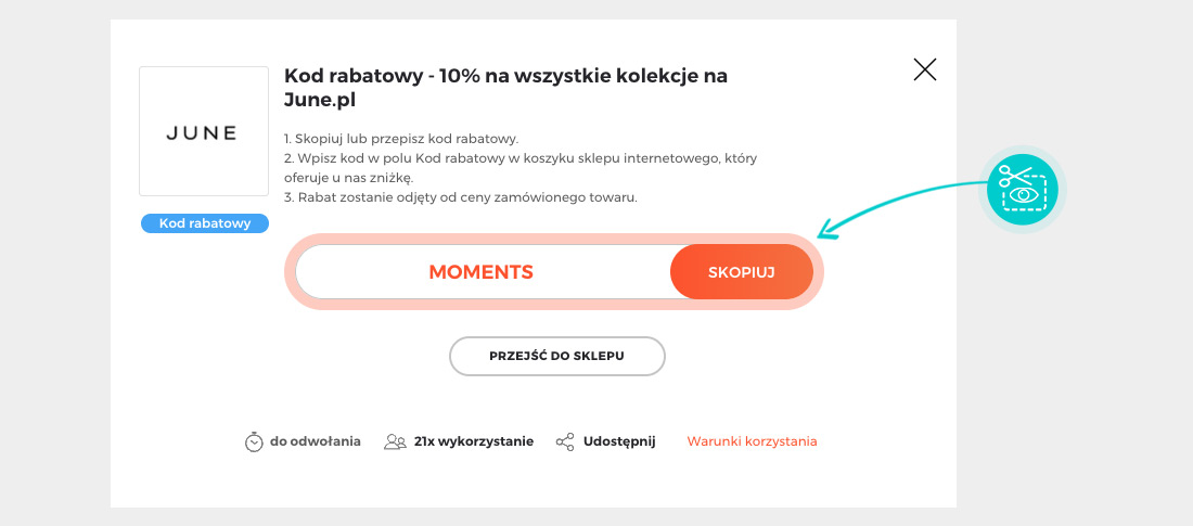 Wybierz na naszej stronie konkretny kod rabatowy, którego chcesz użyć w sklepie internetowym June. Następnie kliknij pomarańczowy przycisk "Wyświetl kod".