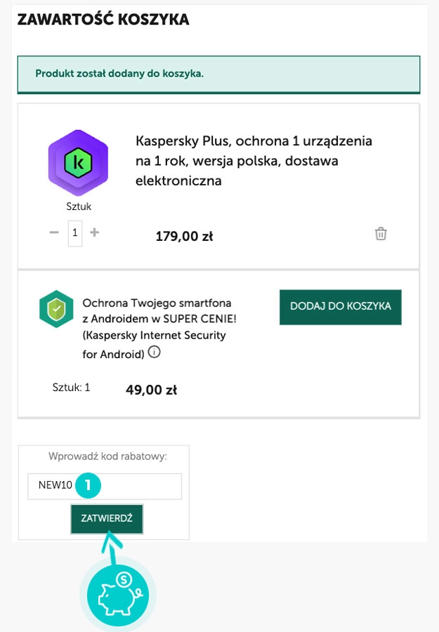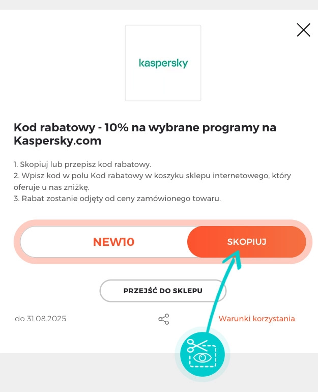 Skopiuj lub zapisz kod rabatowy, a następnie kliknij przycisk "Przejdź do sklepu". Zostaniesz automatycznie przekierowany do platformy Kaspersky.com.