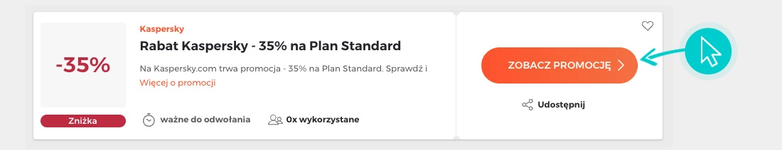 Wybierz konkretny rabat z Kaspersky na naszej stronie i kliknij przycisk "Zobacz promocję". Zostaniesz automatycznie przekierowany do oferty promocyjnej w sklepie internetowym Kaspersky.com, gdzie możesz kupić wybraną usługę ze świetną zniżką.