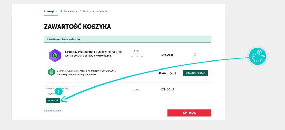 Wybierz na platformie Kaspersky.com usługę, który Cię interesuje, naciśnij przycisk "Kup teraz", a usługa automatycznie zostanie dodana do Twojego koszyka z zamówieniem. Po prawej stronie, w sekcji "Zawartość koszyka" znajdziesz pole "Mam kod rabatowy". Tutaj wklej skopiowany kod rabatowy bądź wprowadź go ręcznie, i zatwierdź przyciskiem, a następnie zaznacz "Kontynuuj".