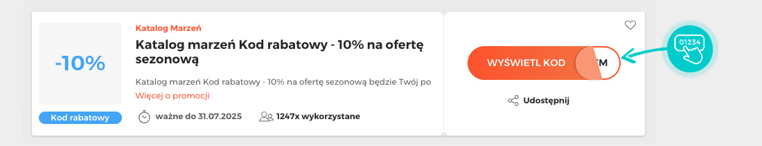 Wybierz na naszej stronie określony kod rabatowy, który chcesz zastosować w sklepie internetowym Katalogmarzen.pl. Kliknij pomarańczowy przycisk „Wyświetl kod”.