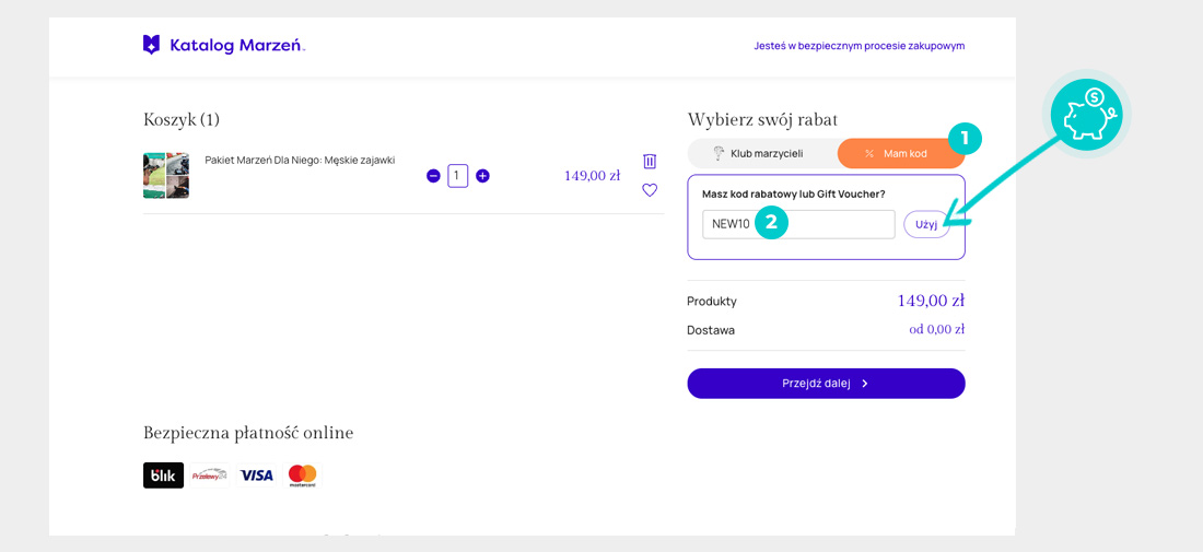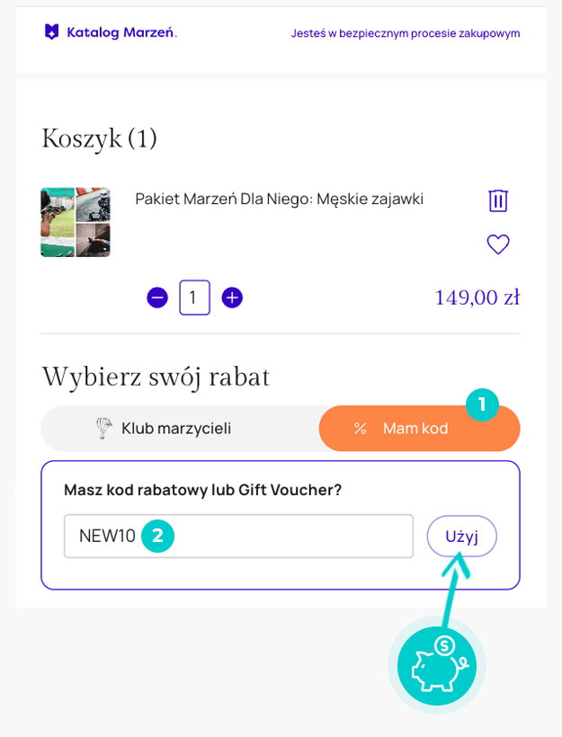 Wybierz produkt w e-sklepie Katalogmarzen.pl który Cię interesuje, naciśnij przycisk "Kup", a produkt zostanie automatycznie dodany do koszyka. Bezpośrednio w koszyku znajdziesz pole „Kupon podarunkowy lub rabatowy” pod wybranym produktem. Wpisz tutaj skopiowany kod rabatowy lub wprowadź go ręcznie i potwierdź przyciskiem „Zastosuj”.