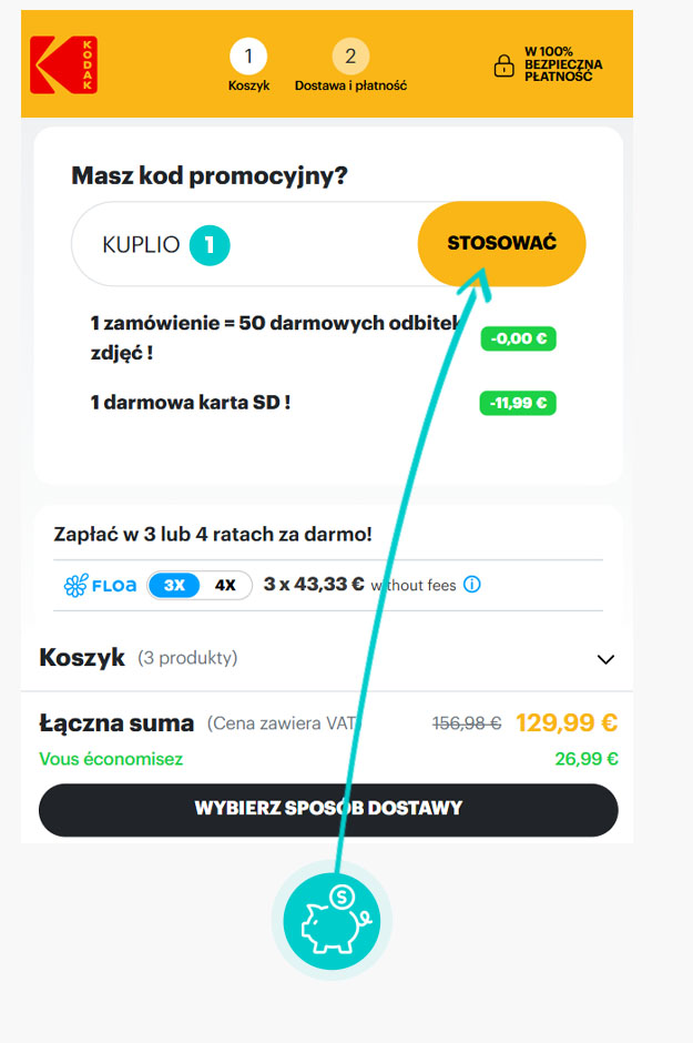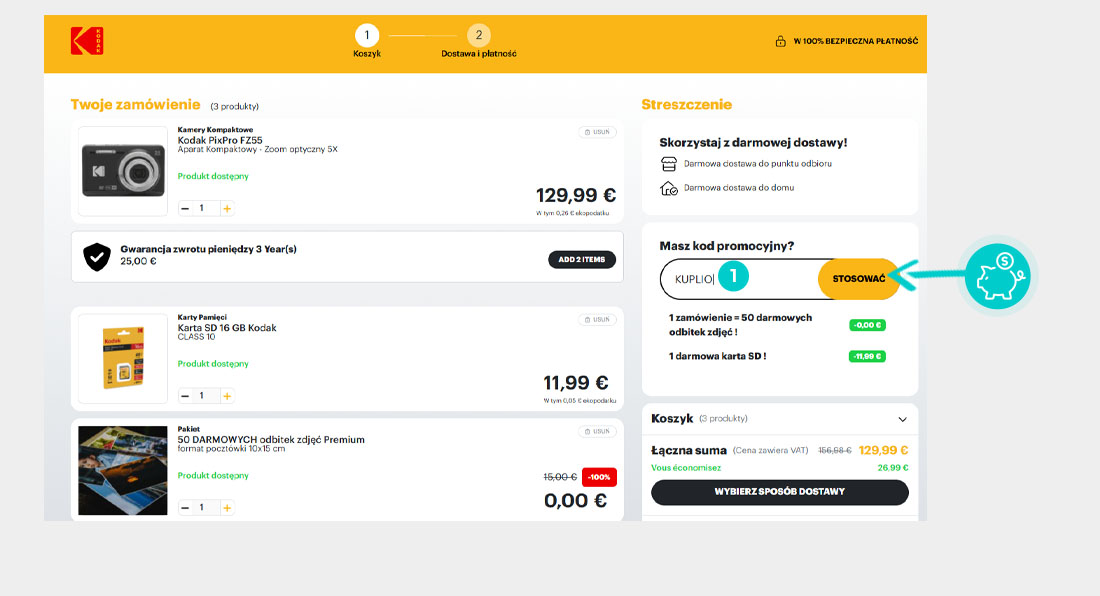 Wybierz produkt w e-sklepie Kodak.com który Cię interesuje, naciśnij przycisk "Kup", a produkt zostanie automatycznie dodany do koszyka. Bezpośrednio w koszyku znajdziesz pole „Kupon podarunkowy lub rabatowy” pod wybranym produktem. Wpisz tutaj skopiowany kod rabatowy lub wprowadź go ręcznie i potwierdź przyciskiem „Zastosuj”.