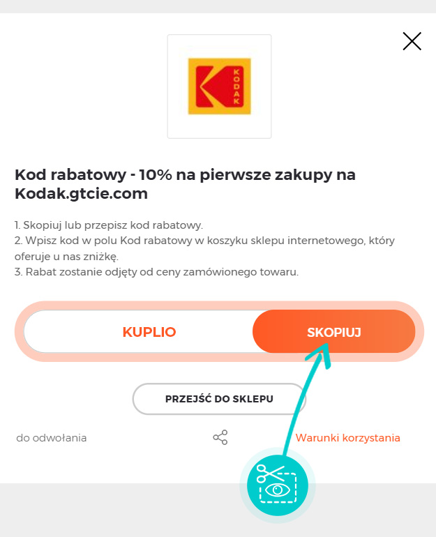 Skopiuj lub zapisz kod rabatowy i kliknij przycisk "Przejdź do sklepu". Nastąpi przekierowanie bezpieśrednio do sklepu internetowego Kodak.com.