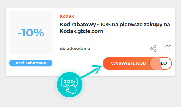 Wybierz na naszej stronie określony kod rabatowy, który chcesz zastosować w sklepie internetowym Kodak.com. Kliknij pomarańczowy przycisk „Wyświetl kod”.