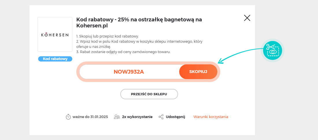 Skopiujcie lub zapiszcie kod rabatowy, a następnie kliknijcie przycisk "Przejdź do sklepu". Zostaniecie automatycznie przekierowani do sklepu internetowego Kohersen.pl.