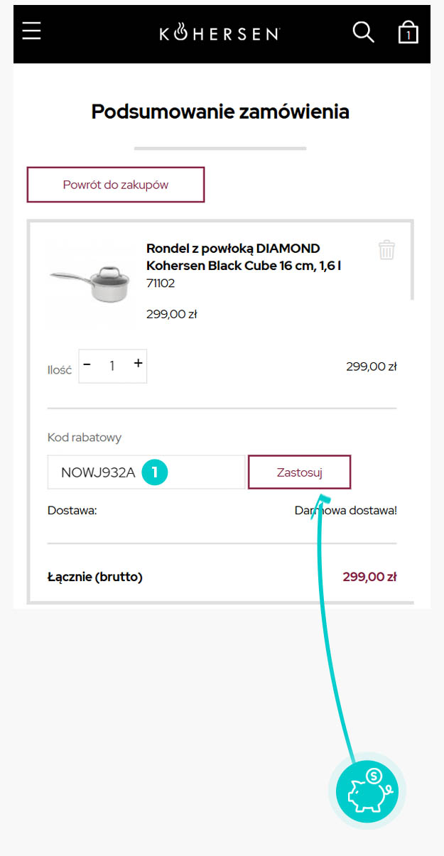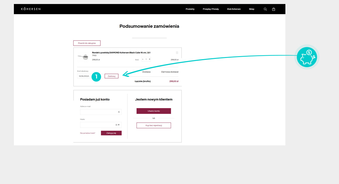 Wybierzcie w e-sklepie Kohersen.pl produkt, który was interesuje, naciśnijcie przycisk "Dodaj do koszyka", a produkt automatycznie zostanie dodany do waszego koszyka z zamówieniem. Po prawej stronie, w sekcji "Podsumowanie zamówienia" znajdziecie pole "Kod rabatowy". Tutaj wklejcie skopiowany kod rabatowy bądź wprowadźcie go ręcznie, i zatwierdźcie przyciskiem "Zastosuj", a następnie "Kup".
