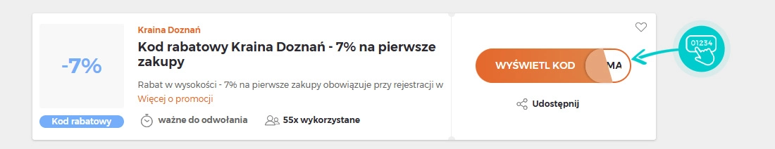 Wybierz na naszej stronie określony kod rabatowy, który chcesz zastosować w sklepie internetowym Kraina-doznan.pl. Kliknij pomarańczowy przycisk „Wyświetl kod”.