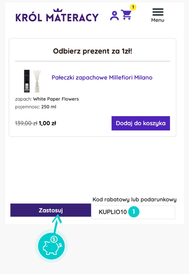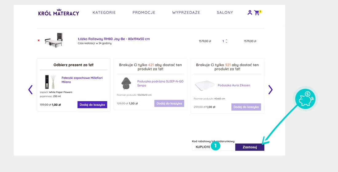 Wybierz produkt w e-sklepie Krolmateracy.pl który Cię interesuje, naciśnij przycisk "Kup", a produkt zostanie automatycznie dodany do koszyka. Bezpośrednio w koszyku znajdziesz pole „Kupon podarunkowy lub rabatowy” pod wybranym produktem. Wpisz tutaj skopiowany kod rabatowy lub wprowadź go ręcznie i potwierdź przyciskiem „Zastosuj”.