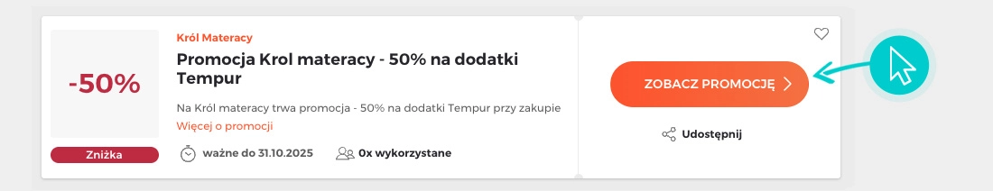 Wybierz konkretny rabat Król Materacy na naszej stronie i kliknij przycisk "Zobacz promocje". Zostaniesz automatycznie przekierowany bezpośrednio do oferty specjalnej w sklepie internetowym Krolmateracy.pl, w którym możesz kupić produkt ze zniżką.