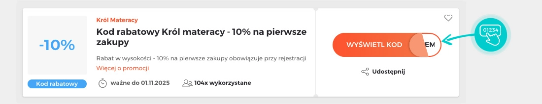 Wybierz na naszej stronie określony kod rabatowy, który chcesz zastosować w sklepie internetowym Krolmateracy.pl. Kliknij pomarańczowy przycisk „Wyświetl kod”.