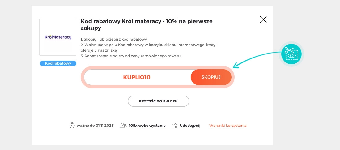 Skopiuj lub zapisz kod rabatowy i kliknij przycisk "Przejdź do sklepu". Nastąpi przekierowanie bezpieśrednio do sklepu internetowego Krolmateracy.pl.