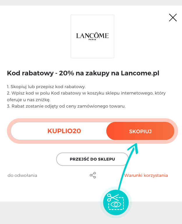 Skopiuj lub zapisz kod rabatowy i kliknij przycisk "Przejdź do sklepu". Nastąpi przekierowanie bezpieśrednio do sklepu internetowego Lancome.pl.