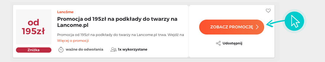 Wybierz konkretny rabat Lancome na naszej stronie i kliknij przycisk "Zobacz promocje". Zostaniesz automatycznie przekierowany bezpośrednio do oferty specjalnej w sklepie internetowym Lancome.pl, w którym możesz kupić produkt ze zniżką.