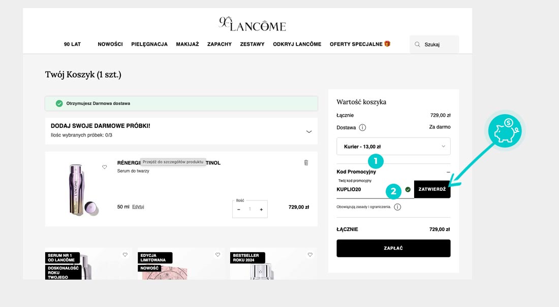 Wybierz produkt w e-sklepie Lancome.pl który Cię interesuje, naciśnij przycisk "Kup", a produkt zostanie automatycznie dodany do koszyka. Bezpośrednio w koszyku znajdziesz pole „Kupon podarunkowy lub rabatowy” pod wybranym produktem. Wpisz tutaj skopiowany kod rabatowy lub wprowadź go ręcznie i potwierdź przyciskiem „Zastosuj”.