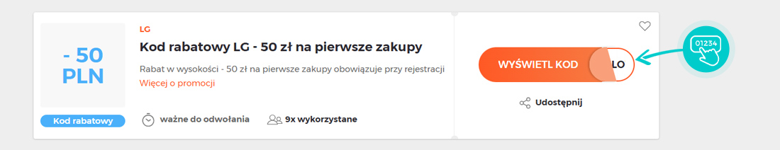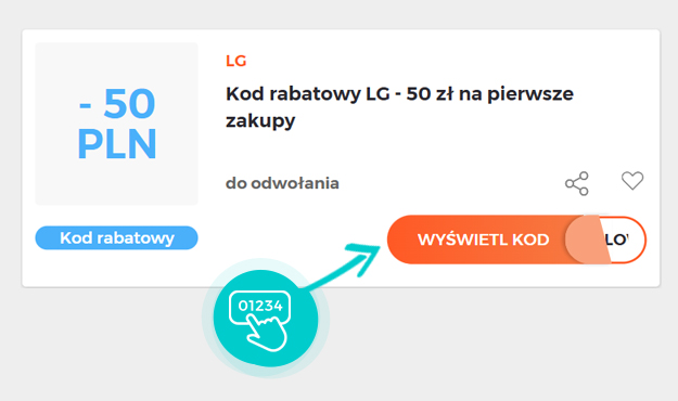 Wybierz na naszej stronie określony kod rabatowy, który chcesz zastosować w sklepie internetowym LG.com. Kliknij pomarańczowy przycisk „Wyświetl kod”.