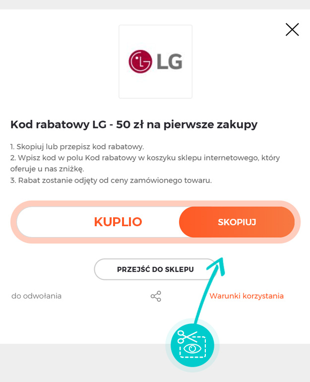 Skopiuj lub zapisz kod rabatowy i kliknij przycisk "Przejdź do sklepu". Nastąpi przekierowanie bezpieśrednio do sklepu internetowego LG.com.