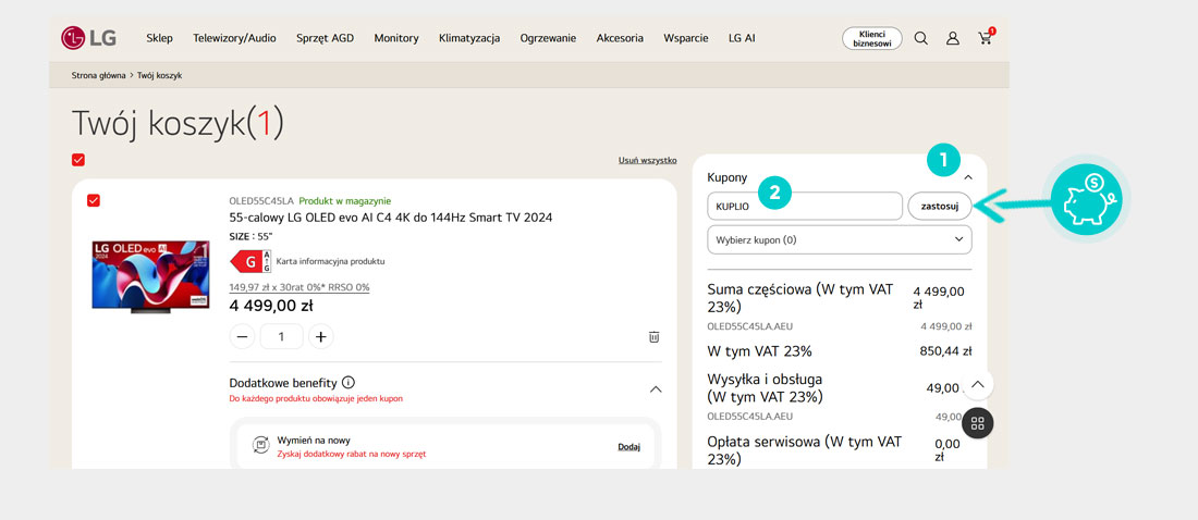 Wybierz produkt w e-sklepie LG.com który Cię interesuje, naciśnij przycisk "Kup", a produkt zostanie automatycznie dodany do koszyka. Bezpośrednio w koszyku znajdziesz pole „Kupon podarunkowy lub rabatowy” pod wybranym produktem. Wpisz tutaj skopiowany kod rabatowy lub wprowadź go ręcznie i potwierdź przyciskiem „Zastosuj”.