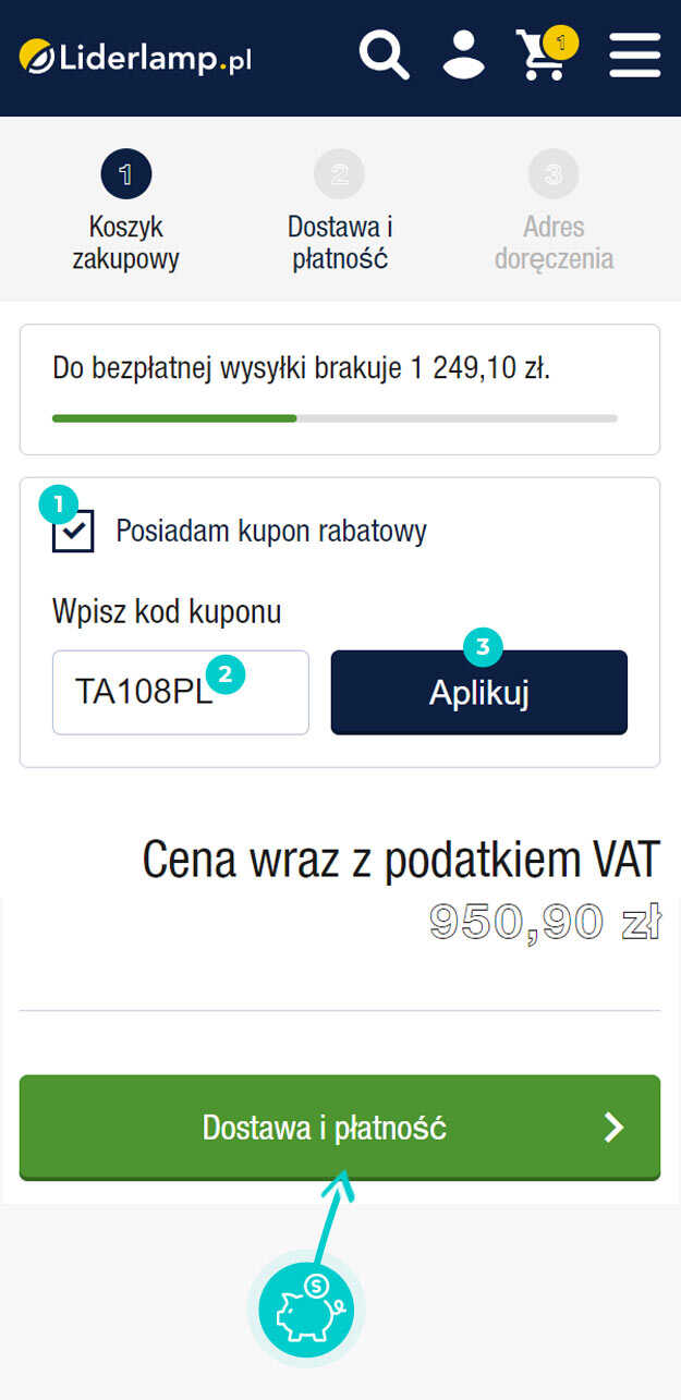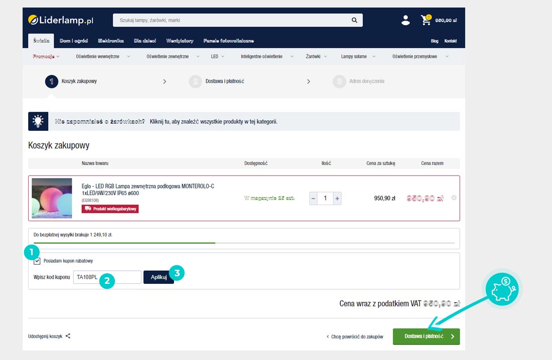 Wybierz w e-sklepie Liderlamp.pl produkt, który Cię interesuje, naciśnij przycisk "Dodaj do koszyka", a produkt automatycznie zostanie dodany do Twojego koszyka z zamówieniem. Po prawej stronie, w sekcji "Koszyk zakupowy" znajdziesz pole "Posiadam kupon rabatowy". Tutaj wklej skopiowany kod rabatowy bądź wprowadź go ręcznie, i zatwierdź przyciskiem "Aplikuj", a następnie "Dostawa i płatność".