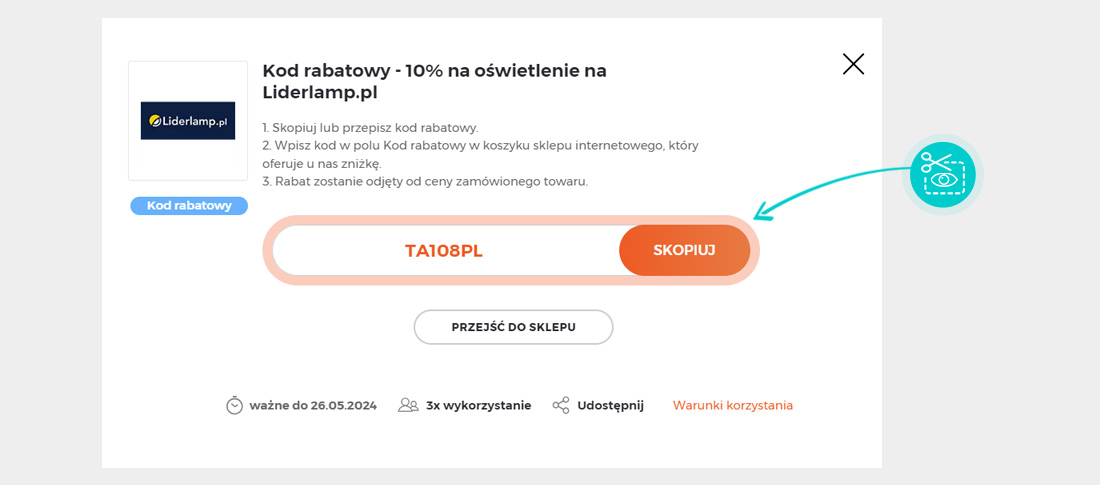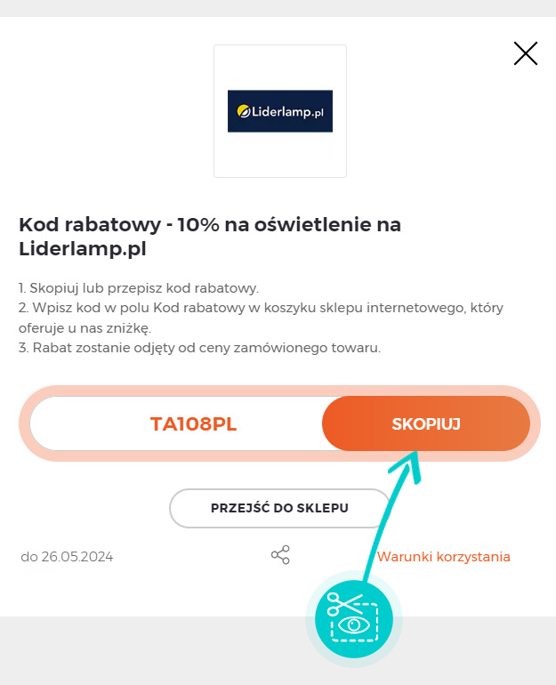 Skopiuj lub zapisz kod rabatowy, a następnie kliknij przycisk "Przejdź do sklepu". Zostaniesz automatycznie przekierowany do sklepu internetowego Liderlamp.pl.