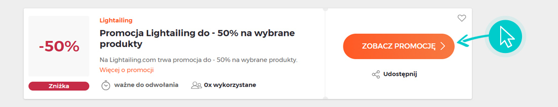 Wybierz konkretny rabat Lightailing na naszej stronie i kliknij przycisk "Zobacz promocje". Zostaniesz automatycznie przekierowany bezpośrednio do oferty specjalnej w sklepie internetowym Lightailing.com, w którym możesz kupić produkt ze zniżką.