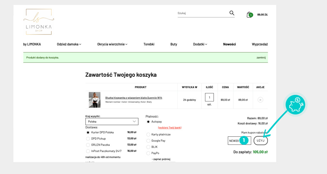 Wybierz produkt w e-sklepie Limonkashop.pl który Cię interesuje, naciśnij przycisk "Kup", a produkt zostanie automatycznie dodany do koszyka. Bezpośrednio w koszyku znajdziesz pole „Kupon podarunkowy lub rabatowy” pod wybranym produktem. Wpisz tutaj skopiowany kod rabatowy lub wprowadź go ręcznie i potwierdź przyciskiem „Zastosuj”.