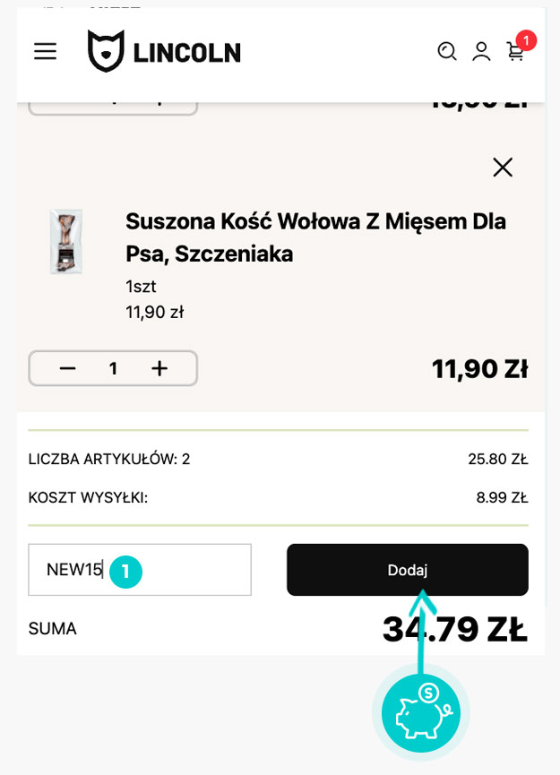 Wybierz produkt w e-sklepie Lincolnpetfood.pl który Cię interesuje, naciśnij przycisk "Kup", a produkt zostanie automatycznie dodany do koszyka. Bezpośrednio w koszyku znajdziesz pole „Kupon podarunkowy lub rabatowy” pod wybranym produktem. Wpisz tutaj skopiowany kod rabatowy lub wprowadź go ręcznie i potwierdź przyciskiem „Zastosuj”.