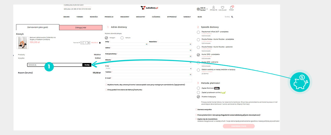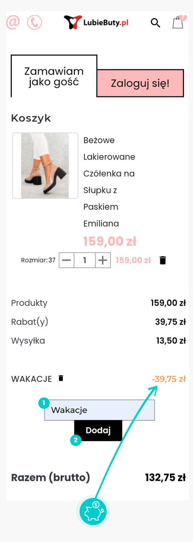 Wybierz w e-sklepie Lubiebuty.pl produkt, który Cię interesuje, naciśnij przycisk "Dodaj do koszyka", a produkt automatycznie zostanie dodany do Twojego koszyka z zamówieniem. Po prawej stronie, w sekcji "Koszyk" znajdziesz pole "Kod rabatowy". Tutaj wklej skopiowany kod rabatowy bądź wprowadź go ręcznie, i zatwierdź przyciskiem "Dodaj", a następnie "Zamawiam i płacę".