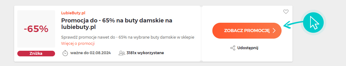 Wybierz konkretny rabat z Lubie Buty na naszej stronie i kliknij przycisk "Zobacz promocję". Zostaniesz automatycznie przekierowany do oferty promocyjnej w sklepie internetowym Lubiebuty.pl, gdzie możesz kupić wybrany produkt ze świetną zniżką.