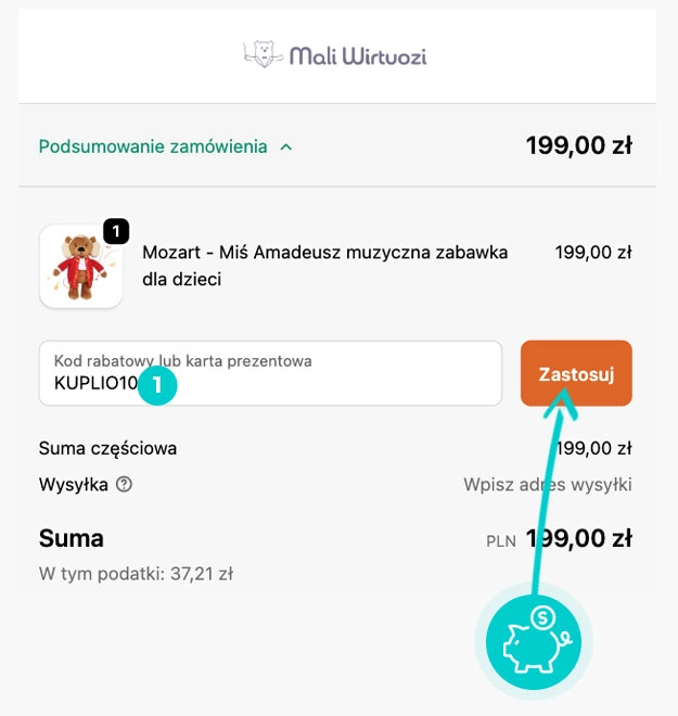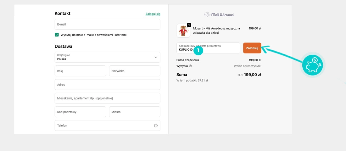 Wybierz produkt w e-sklepie Maliwirtuozi.pl który Cię interesuje, naciśnij przycisk "Kup", a produkt zostanie automatycznie dodany do koszyka. Bezpośrednio w koszyku znajdziesz pole „Kupon podarunkowy lub rabatowy” pod wybranym produktem. Wpisz tutaj skopiowany kod rabatowy lub wprowadź go ręcznie i potwierdź przyciskiem „Zastosuj”.