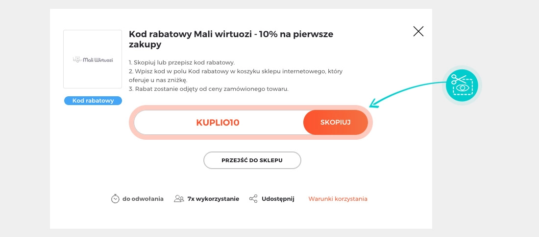 Wybierz na naszej stronie określony kod rabatowy, który chcesz zastosować w sklepie internetowym Maliwirtuozi.pl. Kliknij pomarańczowy przycisk „Wyświetl kod”.