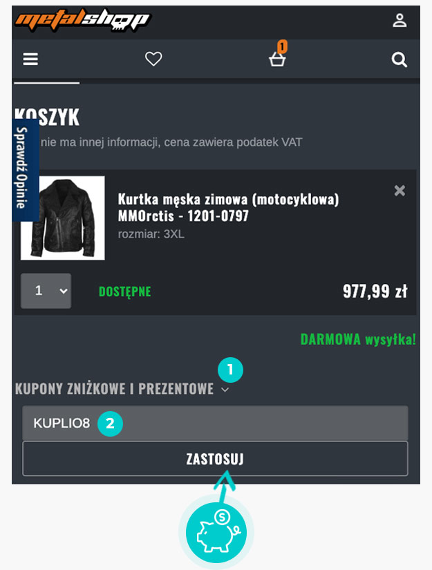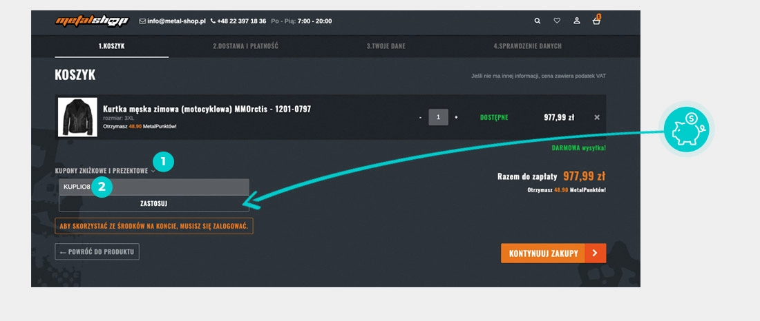 Wybierzcie w e-sklepie Metal-shop.pl produkt, który was interesuje, naciśnijcie przycisk "Dodaj do koszyka", a produkt automatycznie zostanie dodany do waszego koszyka z zamówieniem. Po prawej stronie, w sekcji "Koszyk" znajdziecie pole "Kupony zniżkowe i prezentowe". Tutaj wklejcie skopiowany kod rabatowy bądź wprowadźcie go ręcznie, i zatwierdźcie przyciskiem "Zastosuj", a następnie "Kontynuuj zakupy".