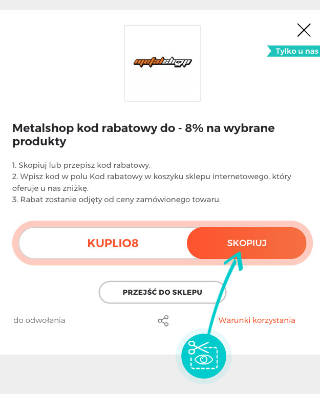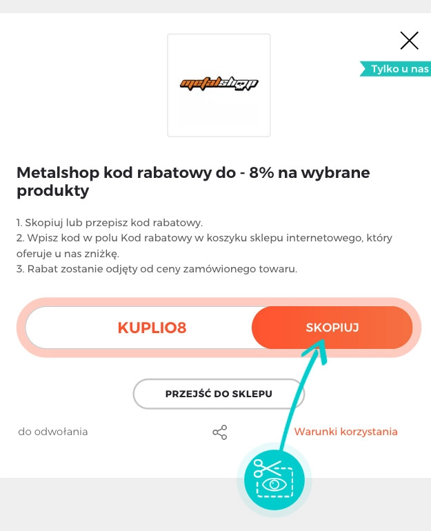 Wybierzcie konkretny rabat z Metalshop na naszej stronie i kliknijcie przycisk "Zobacz promocję". Zostaniecie automatycznie przekierowani do oferty promocyjnej w sklepie internetowym Metal-shop.pl, gdzie możecie kupić wybrany produkt ze świetną zniżką.