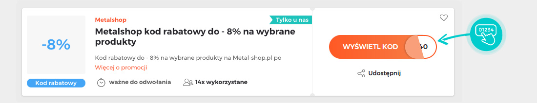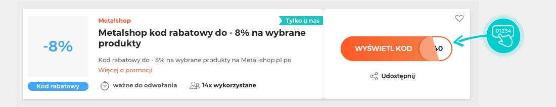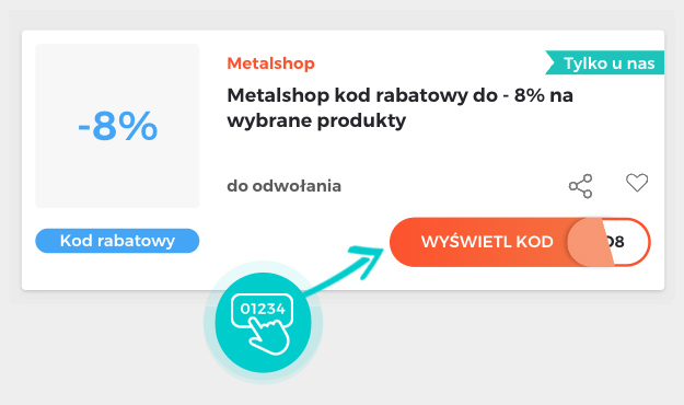 Wybierzcie na naszej stronie konkretny kod rabatowy, którego chcecie użyć w sklepie internetowym Metal-shop.pl. Następnie kliknijcie pomarańczowy przycisk "Wyświetl kod".