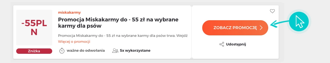 Wybierz konkretny rabat z miskakarmy na naszej stronie i kliknij przycisk "Zobacz promocję". Zostaniesz automatycznie przekierowany do oferty promocyjnej w sklepie internetowym miskakarmy.pl, gdzie możesz kupić wybrany produkt ze świetną zniżką.