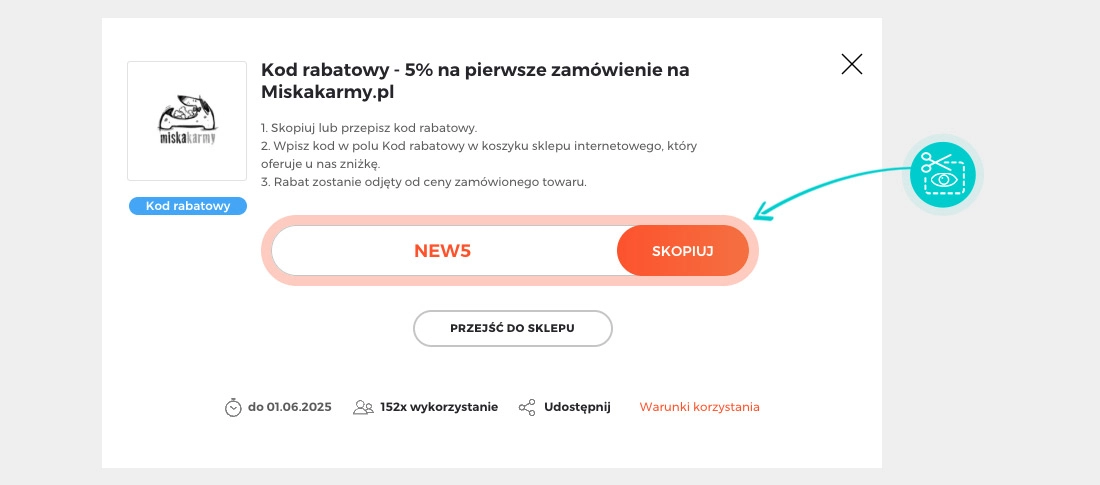 Skopiuj lub zapisz kod rabatowy, a następnie kliknij przycisk "Przejdź do sklepu". Zostaniesz automatycznie przekierowany do sklepu internetowego miskakarmy.pl.