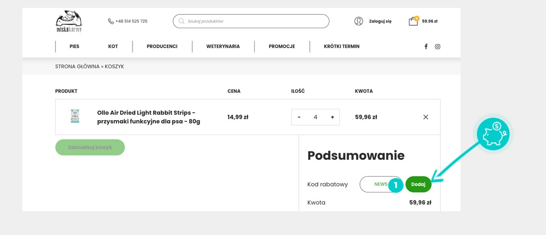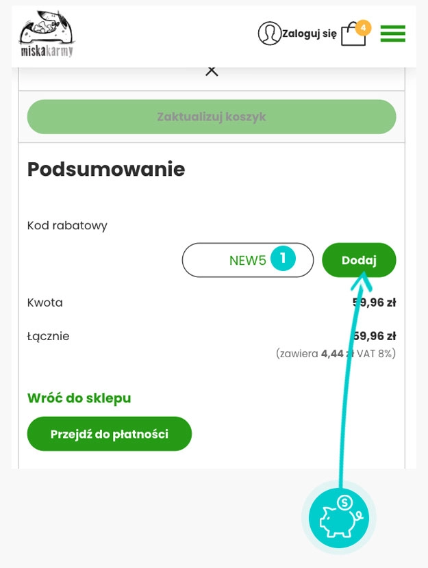 Wybierz w e-sklepie miskakarmy.pl produkt, który Cię interesuje, naciśnij przycisk "Dodaj do koszyka", a produkt automatycznie zostanie dodany do Twojego koszyka z zamówieniem. Po prawej stronie, w sekcji "Koszyk" znajdziesz pole "Kod rabatowy". Tutaj wklej skopiowany kod rabatowy bądź wprowadź go ręcznie, i zatwierdź przyciskiem, a następnie zaznacz "Przejdź do płatności".