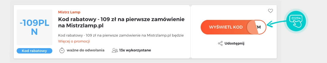 Wybierz na naszej stronie określony kod rabatowy, który chcesz zastosować w sklepie internetowym Mistrzlamp.pl. Kliknij pomarańczowy przycisk „Wyświetl kod”