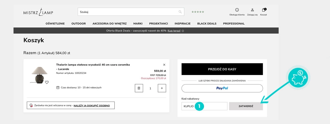 Wybierz produkt w e-sklepie Mistrzlamp.pl który Cię interesuje, naciśnij przycisk "Kup", a produkt zostanie automatycznie dodany do koszyka. Bezpośrednio w koszyku znajdziesz pole „Kupon podarunkowy lub rabatowy” pod wybranym produktem. Wpisz tutaj skopiowany kod rabatowy lub wprowadź go ręcznie i potwierdź przyciskiem „Zastosuj”.