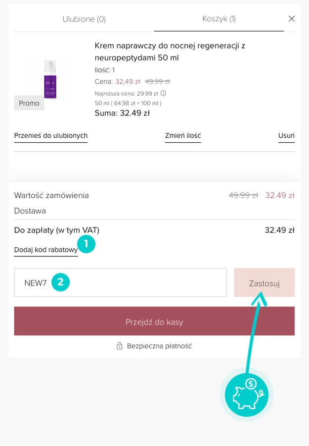 Wybierz produkt w e-sklepie Miyacosmetics.com który Cię interesuje, naciśnij przycisk "Kup", a produkt zostanie automatycznie dodany do koszyka. Bezpośrednio w koszyku znajdziesz pole „Kupon podarunkowy lub rabatowy” pod wybranym produktem. Wpisz tutaj skopiowany kod rabatowy lub wprowadź go ręcznie i potwierdź przyciskiem „Zastosuj”.
