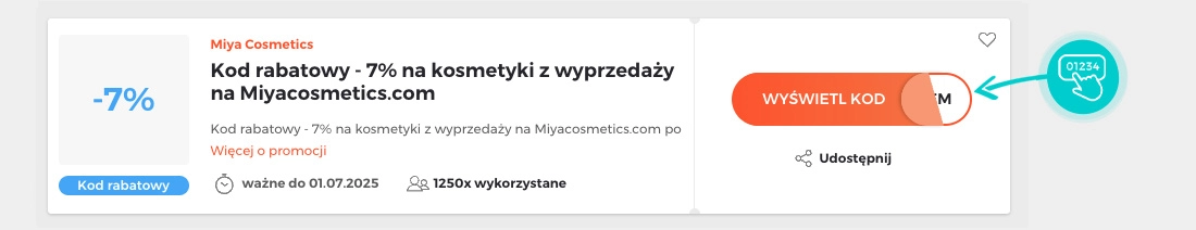 Wybierz na naszej stronie określony kod rabatowy, który chcesz zastosować w sklepie internetowym Miyacosmetics.com. Kliknij pomarańczowy przycisk „Wyświetl kod”.