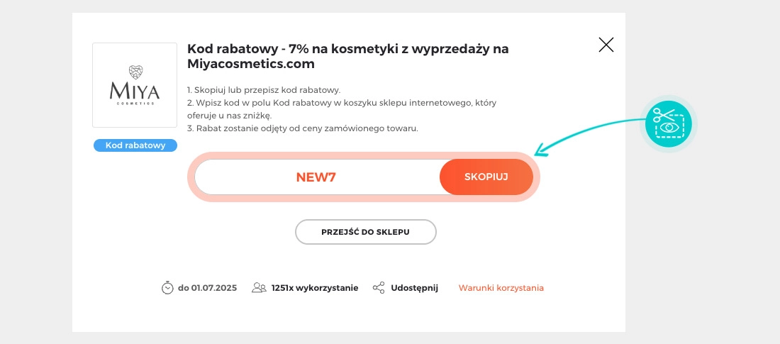 Skopiuj lub zapisz kod rabatowy i kliknij przycisk "Przejdź do sklepu". Nastąpi przekierowanie bezpieśrednio do sklepu internetowego Miyacosmetics.com.