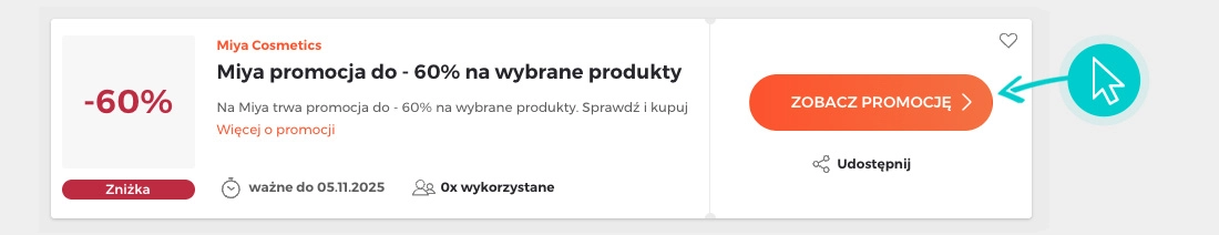 Wybierz konkretny rabat Miya Cosmetics na naszej stronie i kliknij przycisk "Zobacz promocje". Zostaniesz automatycznie przekierowany bezpośrednio do oferty specjalnej w sklepie internetowym Miyacosmetics.com, w którym możesz kupić produkt ze zniżką.