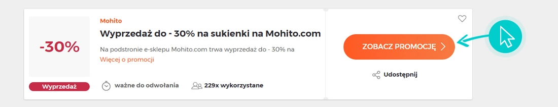 Wybierz konkretny rabat Mohito na naszej stronie i kliknij przycisk "Zobacz promocje". Zostaniesz automatycznie przekierowany bezpośrednio do oferty specjalnej w sklepie internetowym Mohito.com, w którym możesz kupić produkt ze zniżką.