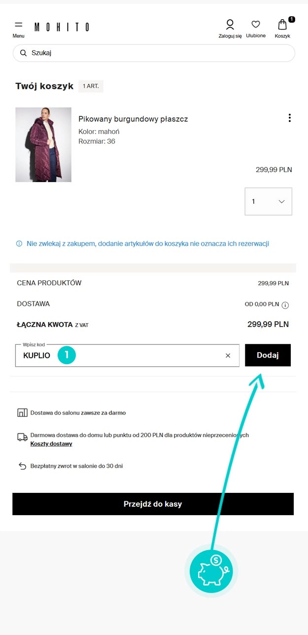 Skopiuj lub zapisz kod rabatowy i kliknij przycisk "Przejdź do sklepu". Nastąpi przekierowanie bezpieśrednio do sklepu internetowego Mohito.com.