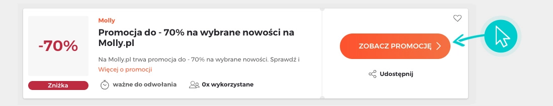 Wybierz konkretny rabat Molly na naszej stronie i kliknij przycisk "Zobacz promocje". Zostaniesz automatycznie przekierowany bezpośrednio do oferty specjalnej w sklepie internetowym Molly.pl, w którym możesz kupić produkt ze zniżką.